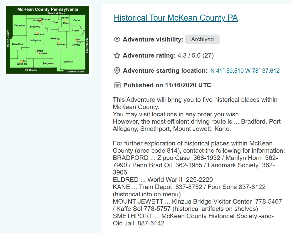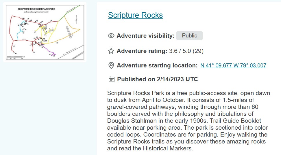 N 41° 57.502 W 78° 23.149 … Coordinates bring you to the entrance. Look around to discover the answer.