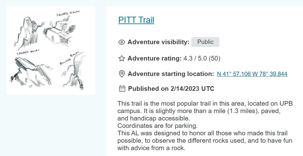 This is the most popular trail in McKean with hundreds enjoying a walk along the paved surface. 1.3 miles parking to end of trail. Take a moment to honor who this rock is dedicated to. Take another moment to observe the incredible beauty of the rock.