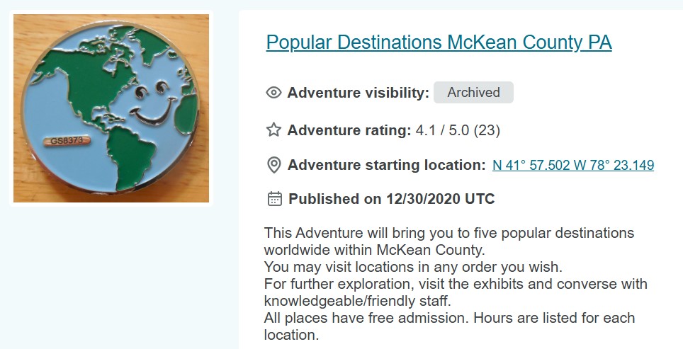 N 41° 39.527 W 78° 48.663 … Coordinates bring you to the entrance of the McCleery Discovery Center located in the Kane Train Depot. Look around to discover the wolf sculptures made of slian (unscramble for answer).