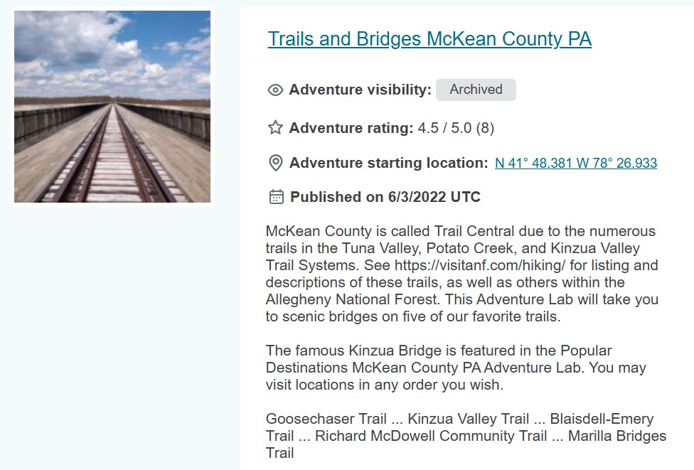 A 10.2-mile multi-use trail located along the banks of the scenic Kinzua Creek. The surface is crushed limestone. There are four trailheads … Tally Ho, _, Westline, and Red Bridge Trailhead. Difficulty level is moderate.
