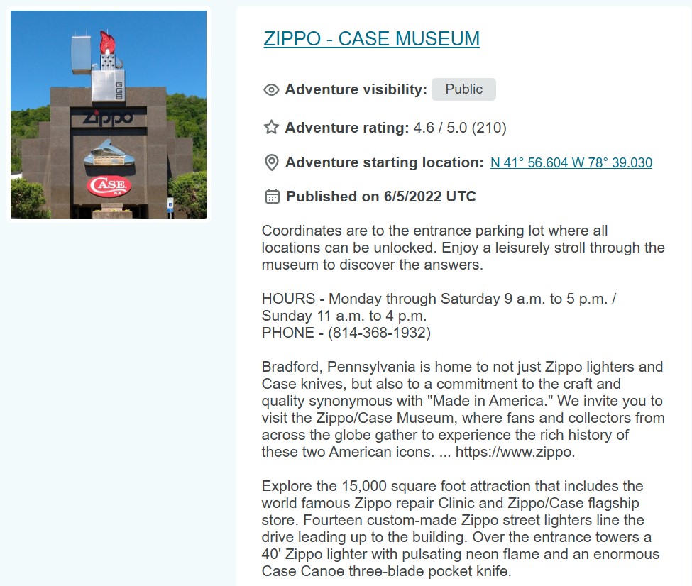 The Zippo-Case Museum Adventure Lab is located here. From the parking lot, you can unlock all locations before entering the museum. Then, enjoy a leisurely stroll through the museum to discover the answers.