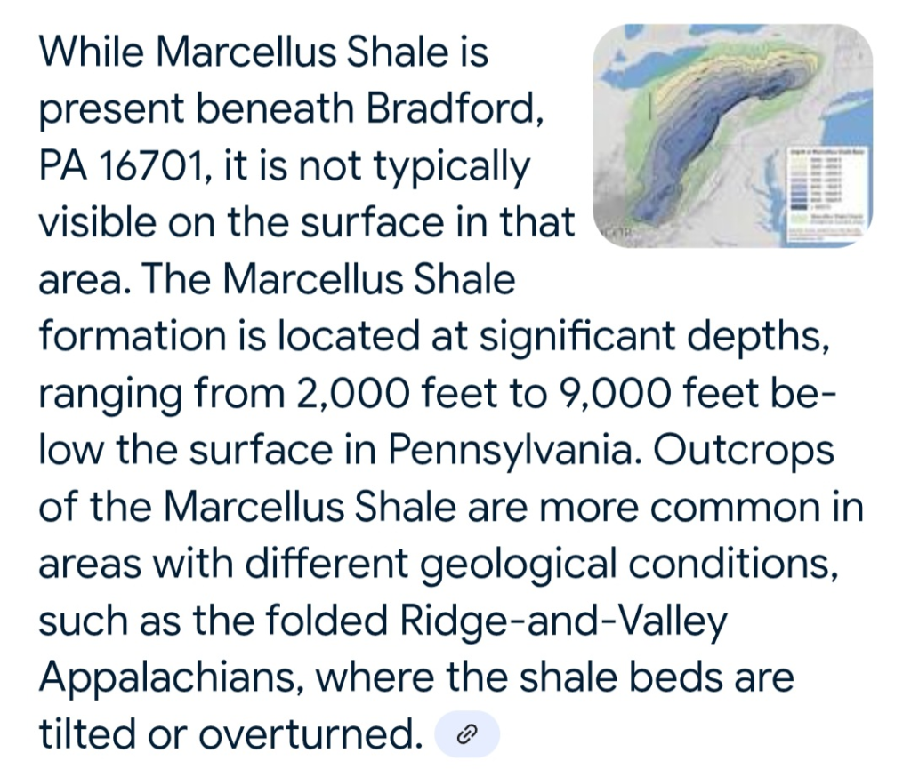 The Marcellus Formation of PA https://coord.info/GCB4DAP (ANF Detective Bradford Area Shales https://coord.info/GC635VR – location referenced in this cache and clearly seen in Google)